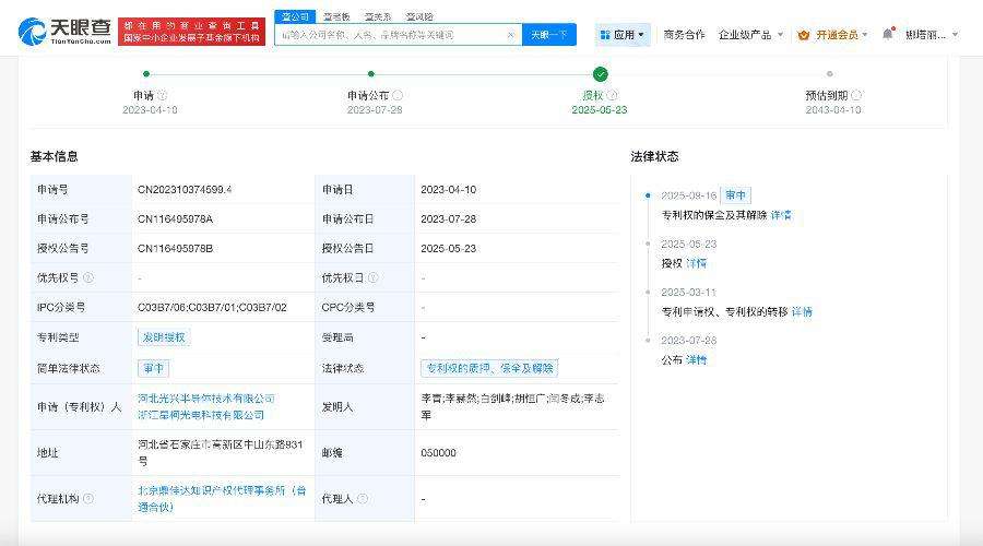 此外,天眼查显示,星柯光电拥有的 2024 年之前的专利主要为授权类专利,以《玻璃基板生产通道的高温保护方法》(授权公告号:CN116495978B)为例,专利申请(专利权)人为河北光兴半导体技术有限公司和星柯光电。