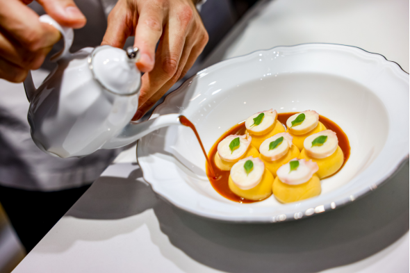开幕式后,来自杭州米其林星级餐厅 ENRICO BARTOLINI 的行政主厨尼古拉斯·雷纳(Mr. Nicholas Reina)先生在现场带来独家烹饪展示。他呈现的招牌菜 “青柠橄榄油意式饺配海鲜酱与章鱼汁”,以清新的地中海风味诠释意大利料理的平衡之美,将传统手艺与现代创意完美结合。