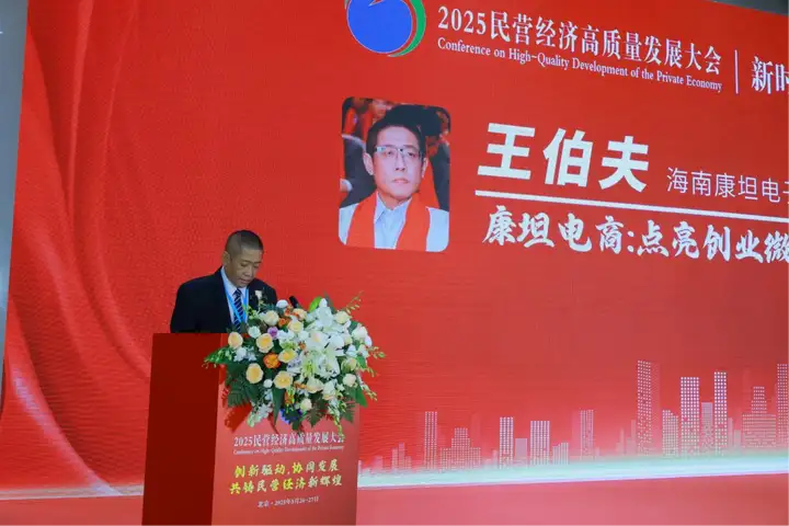 北京 · 2025年 —— “2025 民营经济高质量发展大会”近日在北京召开,来自全国多地的民营企业代表、研究机构与行业专家汇聚一堂,围绕民营经济发展趋势、数字贸易、跨境电商及全球供应链建设等议题展开研讨。海南康坦电子商务集团有限公司(以下简称“康坦集团”)董事长 王伯夫 受邀出席并参与专题讨论。