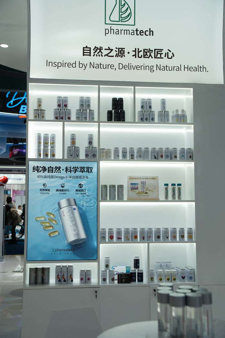 Pharmatech 极光态与DanVitas 丹维斯的联合展位以“自然之力,健康之源”为核心理念,融合北欧简约风格与互动体验,成为展区内的流量高地。