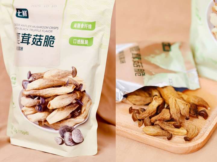 七鲜鹿茸菇脆的推出,进一步展现了七鲜探索行业空白、定义健康新标准的创新力。作为行业首款鹿茸菇脆零食,七鲜舍弃常规白菇,选用营养更丰富、成本高出2-3倍的鹿茸菇。为确保最佳口感,团队历时数月、超过30次反复调试,从确立严格的菇体尺寸标准(菇体过小经油炸易成碎渣、过大则难以炸透影响酥脆度),到不断优化低温真空油炸工艺、确定适合油温,最终实现含水率仅约2%的极致酥脆感,且0反式脂肪酸。原料、工艺成本均显著提升下,产品仍定位19.9元/袋的亲民价格,让健康美味真正成为“轻负担”的日常选择。