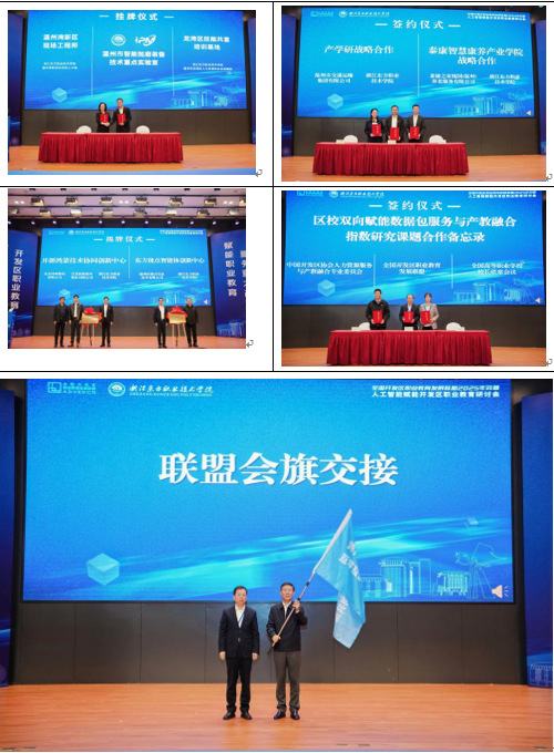 会议期间完成了龙湾区与浙江东方职业技术学院教育科技人才一体化签约仪式,温州湾现场工程师协创中心、温州市智能抛磨装备技术重点实验室、温州湾技能共富培训基地正式挂牌;进行了国企高校产学研战略合作、泰康智慧康养产业学院的签约仪式,共探现代产业学院建设的新路径,为行业精准赋能;完成了开源鸿蒙技术协同创新中心和东方捷点智能体创新中心揭牌仪式,为区域科技创新、人才培养和产业升级提供坚实支撑。会上,成功举行了区校双向赋能数据包服务与产教融合指数研究课题合作备忘录签约仪式,为科学评估与推动产教融合高质量发展提供重要依据;举行了联盟2023-2025年产教融合优秀案例颁奖仪式、联盟会旗交接仪式,标志着联盟在深化协同发展上迈出了新的坚实步伐。
