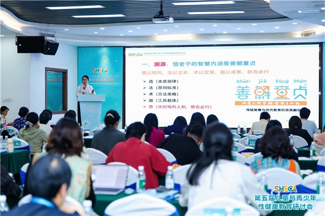 善解童贞公司副总经理张翠在主题《全人格性健康教育的道法术器势》分享中,以老子文化溯源了善解童真品牌的道就是“用爱与科学解读孩子的性”,并已经形成“道以明向、法以立本、术以定策、器以成事、势在必行”的教育智慧。