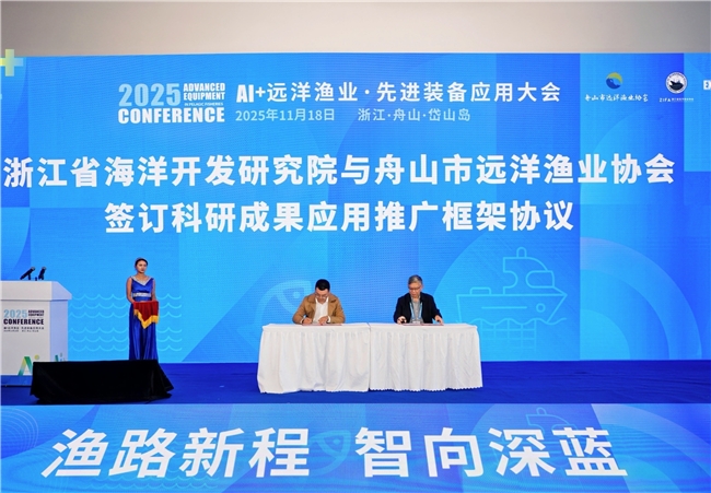 大会还举办了科研机构和知名装备企业与行业合作的签约仪式,致力于扩大最新科研成果和优质产品的市场应用。浙江省海洋研究开发院与舟山市远洋渔业协会签订科研成果中试应用推广合作协议、中远佐敦船舶涂料(青岛)有限公司与浙江省远洋渔业协会签订行业推广合作协议。主办方表示,科技为本,绿色引航,浙江作为全国远洋渔业第一大省,也是人工智能创新发展的先进省份,本次大会集专家报告、企业对接和装备展示介绍为一体,着力拓展AI在远洋渔业的更多商业化应用场景,更好推动供需互促,为我国远洋装备技术的高水平自立自强和规模化应用贡献智慧与力量。