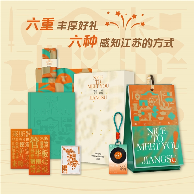 《幸会,江苏!》2026周历礼盒以设计为语言,将十三城的文化差异转化为美学上的互补对话——南京古城墙的厚重与苏州园林花窗的灵秀相映,徐州汉剑的雄浑与宜兴紫砂的温润并存……这不是简单的符号堆叠,而是以“各美其美、美美与共”的构思,重塑江苏的文化叙事。