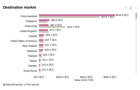根据澳大利亚葡萄酒管理局(Wine Australia)的数据,截止2025年9月,澳大利亚葡萄酒对中国的年出口总量达到7,340万升,同比增长26%;年出口总额达到8.47亿澳元(约合人民币39.25亿元),同比增长39%,显示出澳大利亚葡萄酒在中国市场的持续向好。