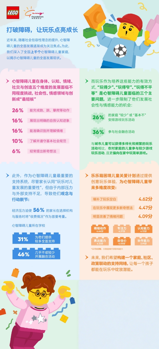 与此同时,乐高集团还希望与晓更基金会进一步推动社会对心智障碍儿童玩乐权利的关注。为此,双方深入全国1,135个心智障碍儿童家庭,通过问卷调查和深度访谈的方式,全面了解心智障碍儿童的发展现状,共同探讨出如何通过游戏化支持赋能他们的全方位成长。双方共同发布了《心智障碍儿童全面发展现状与需求调查报告》。