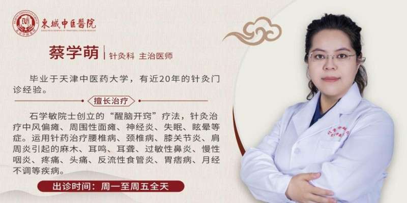 蔡学萌,东城中医医院针灸科主任,出诊时间:周一至周五全天。毕业于天津中医药大学,有近20年的针灸门诊经验。运用石学敏院士创立的“醒脑开窍”疗法,针灸治疗中风偏瘫、周围性面瘫、神经炎、失眠、眩晕等症。运用针药治疗腰椎病、颈椎病、膝关节炎、肩周炎引起的麻木、耳鸣、耳聋、过敏性鼻炎、慢性咽炎、疼痛、头痛、反流性食管炎、胃痞病、月经不调等疾病。