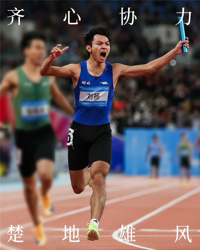 湖北队刘杨与李泽洋等队友通力合作,将男子4×100米接力的金牌收入囊中。