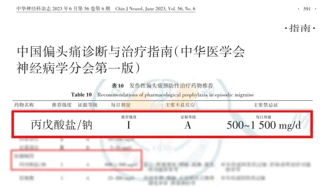 在《2023年中国偏头痛诊断与治疗指南》中,丙戊酸钠被明确列为预防性治疗的一线推荐药物,拥有I级推荐、A级证据,这意味着它是经过严格科学验证的标准化治疗方案。