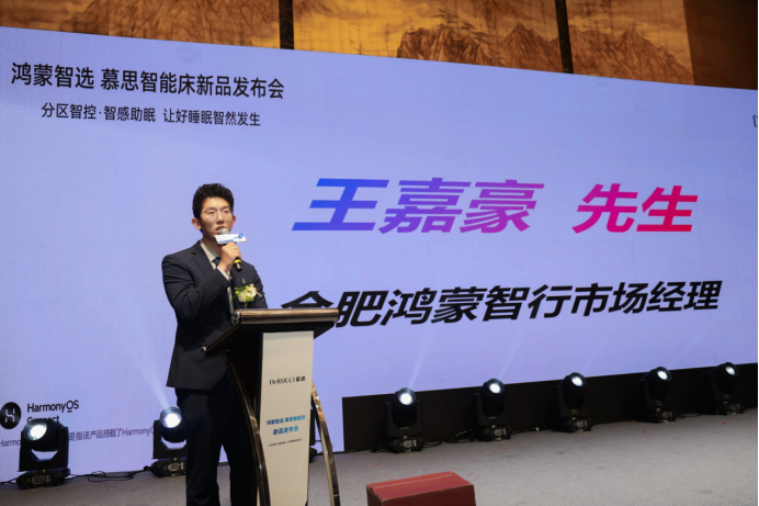 发布会的高潮出现在新品揭幕时刻。在全场倒计时中,慕思与鸿蒙智选的六位负责人共同为“慕思鸿蒙智选智能床Pro·合肥首秀”揭幕。