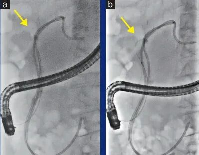 ERCP对影像的依赖程度远高于多数内镜操作。胆管分支细、路径变异多,导丝、网篮等器械尺度细微,稍有伪影或对比度不足,都可能影响操作判断。Ultimax-i X搭载 “Accent”高清引擎,这一技术由佳能医疗与内镜头部企业奥林巴斯(OLYMPUS)联合研发,采用建立在真实病例数据基础上的智能算法,使影像中微小结构更易显现。临床验证显示,对比度可提升 2–2.4 倍,导丝、网篮、支架等ERCP关键器械更易辨识。日本神户大学内镜中心的一例高度胆管狭窄病例(下图)显示,在常规透视模式(a)下导丝难以被识别,而开启Accent模式(b)后,导丝走向在影像中清晰呈现,可视性大幅提升,为后续操作争取了宝贵时间。