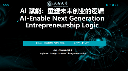 本次活动主讲嘉宾 HOSSIN MD ALTAB(罗祖)博士是电子科技大学博士、成都大学创新创业学院高端外国专家、成都大学数字创新实验室主任、四川省外籍高层次人才。致力于人工智能、大数据、自然语言处理领域研究。获得金沙友谊奖、中国绿卡。在中国学习工作生活 18 年,发表高质量论文120余篇。罗祖老师主题分享了《AI 赋能:重塑未来创业的逻辑》。