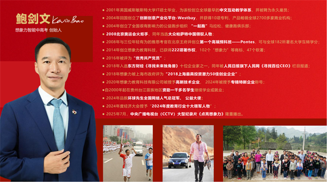 2021年,鲍剑文先生带领团队重磅推出“想象力智能中高考”,秉持“科技赋能教育”理念,打造了教育行业首创的智能导学系统,以科技力量助力学子提升备考效率、实现精准高效学习。鲍剑文先生深耕教育、持续创新的创业故事,更被央视纪录片《点亮想象力》进行专题报道。