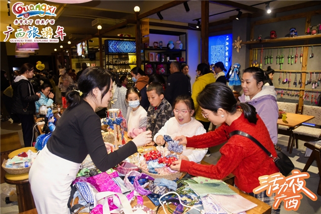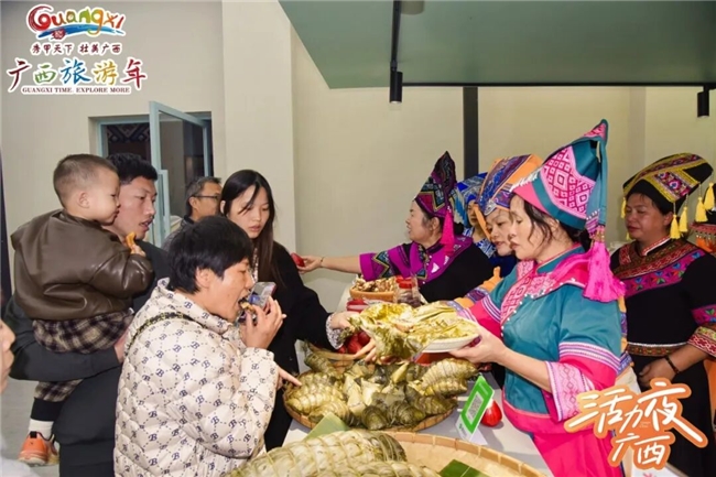 本土文化秀《百色境·踏歌行》以百色传统文化和故事为灵感,用7个特色场景剧目串联起整场活动。非遗大院内的非遗工坊、非遗美食荟分别汇集了麽乜、绣球、壮锦,五色糯米饭、酸嘢、猪血肠等好物美食。