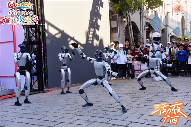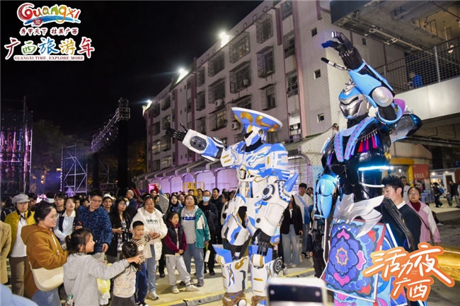 解放街口,“百夜精彩秀”汇聚荧光狮舞、智能机器人、民族机甲和壮族歌舞,用科技表达赋予在地文化新的生命活力,吸引全场目光,瞬间点燃现场气氛,带领市民游客开启难忘的“千姿百色夜”。