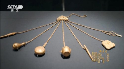 节目的视角从龙袍的恢弘礼制,转入古代生活的精致细节,最终定格于明代錾花金什件。这套出土于万贵墓的金质组合佩饰,以其囊、剪、罐、盒的多样形态与錾刻精工,映射出古代贵族的日常生活美学。錾花金什件中的坠饰之一——花鸟纹香囊,尤为精巧,瞬间吸引了众人的目光。它呈现了香囊在古人生活中兼具的雅致趣味与情感寄托。