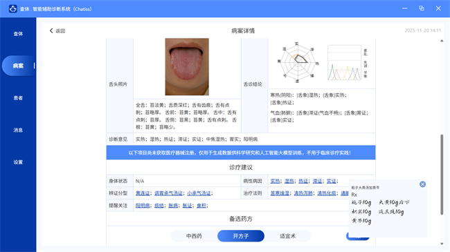 借助知医邦这个中医辅助诊断系统的提示,即便患者无主诉,我也能精准问诊:根据“关注阳明病”的提醒,追问腹胀、食欲、大便等胃肠道问题;结合“痰结”提示,排查梅核气相关的咽喉不适。这种“AI辅助+专业判断”的模式,让我终于摆脱了临床不自信的枷锁。