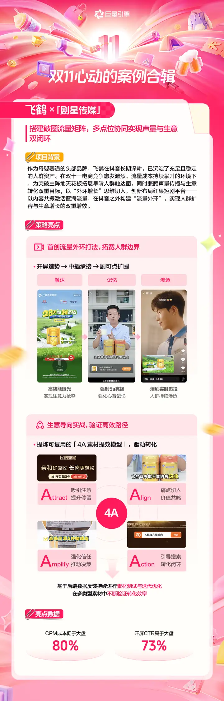 飞鹤选择跳出场内,在抖音之外的红果短剧平台建立“流量外环”。通过内容共振吸引年轻新客,再把用户回流到抖音,实现声量与生意的双闭环。