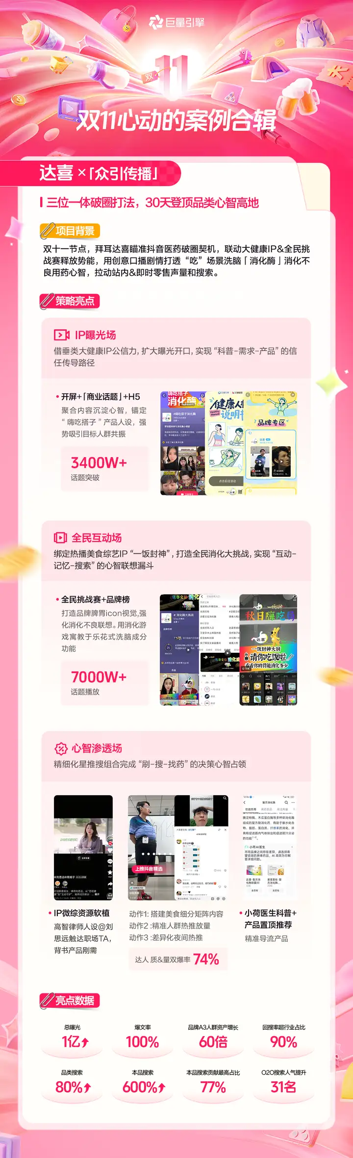 OTC医药的双11战役,考验的是品牌能否同时获得:曝光、公信力、心智突破。达喜以IP曝光场 × 全民互动场 × 星推搜心智渗透场三路并进: