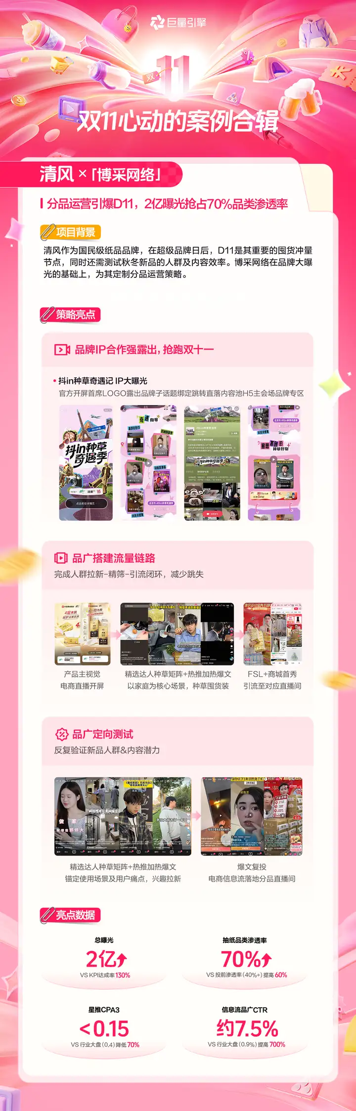 今年双11大促,清风选择做一件事:分品运营。从IP抢跑曝光,到品广搭建“拉新—精筛—引流”链路,再到新品人群验证循环测试,清风的打法不再是“大水漫灌”,而是以 SKU 为单位做精准运营,最终收获了品类渗透率高达 70%的好成绩。