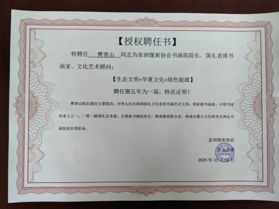 2025年11月25日,亚洲煤炭协会举行隆重聘书颁发仪式,执行会长杨蔚考亲自向国礼大师樊青山同志颁发聘书,正式聘请其担任亚洲煤炭协会书画院院长。