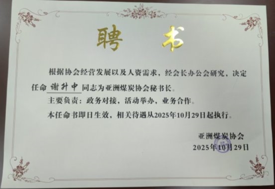2025年11月28日亚洲煤炭协会宣布重要人事任命,执行会长杨蔚考正式聘请谢升中同志担任协会秘书长,全面负责政务对接工作。