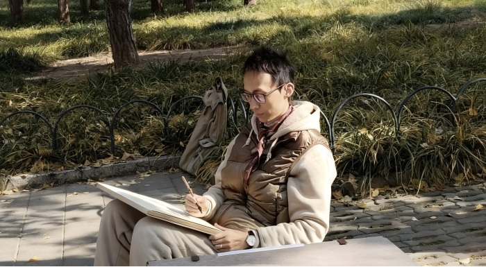 庞啸晨的写生过程,是一场对笔墨关系的精密调度与材质特性的深度对话。他先以枯笔勾勒银杏叶片的筋脉,再施淡墨晕染层次,在“墨分五色”的微妙变化中构建画面骨架;色彩作为墨色的补充,遵循“色不碍墨”的法则,以赭石、花青点染秋意,始终让水墨的浑厚占据主导。远景叶片以“点苔”技法概括,近景则通过勾线与点染的交织,形成疏可走马、密不透风的节奏韵律。