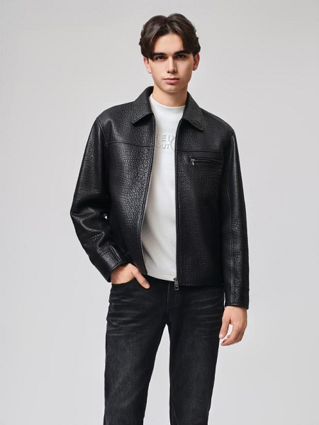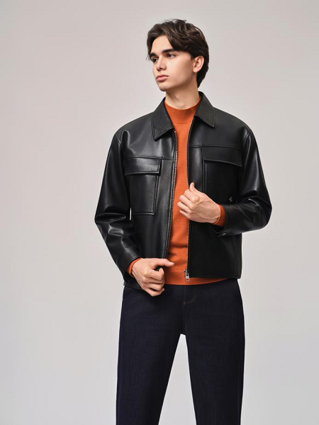 这种“外刚内柔”的搭配哲学,在漆皮皮衣与亮靛色羊毛衫的组合中进一步升级。高光PU复合皮革赋予皮衣如镜面般的质感光泽,而粗针纹花编织的羊毛衫则以饱满肌理与温暖触感与之抗衡,形成“内聚外酯”的戏剧张力。成衣材质的搭配设计,在此不仅是功能化的载体,更能够表达男士当前的情绪与态度。