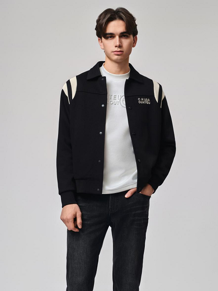 欧度在本系列中多次运用了解构手法,重构经典单品的设计逻辑。黑白拼色棒球外套以黄金分割比例划分色块,结合隐藏式裁刀门襟,在运动风中注入高级时装的精致感;可拆卸侧领的拼色羽绒服,则通过块面分割与科技感提花,实现功能性与美学的平衡。