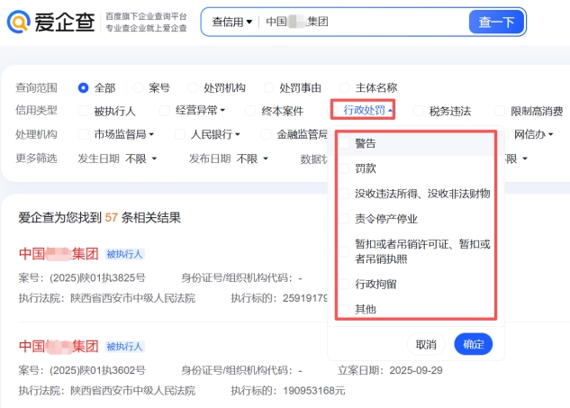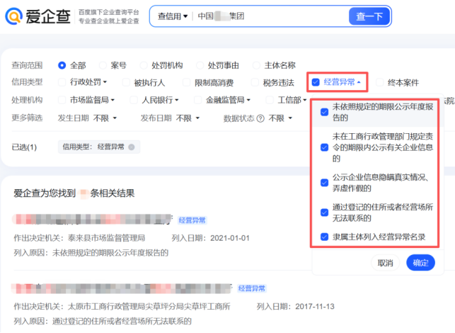 比如,若想有针对性地了解“中国 xx 集团”过往有无异常经营或处罚信息,只需在“信用类型”选项下勾选「经营异常」「行政处罚」两项,即可一键锁定目标信息,直观查看该企业的经营异常具体情形(如住所失联、年报未公示)、行政处罚事由、处理机构及结果等核心内容。
