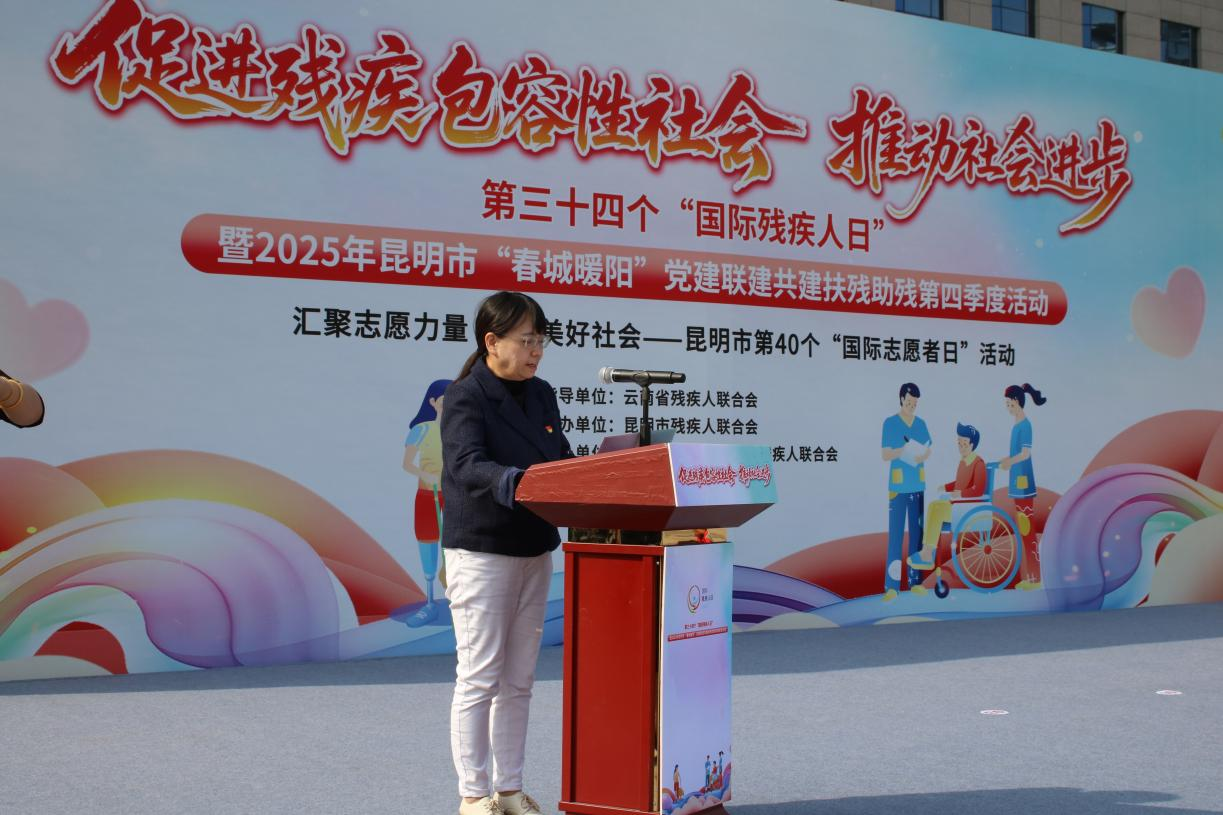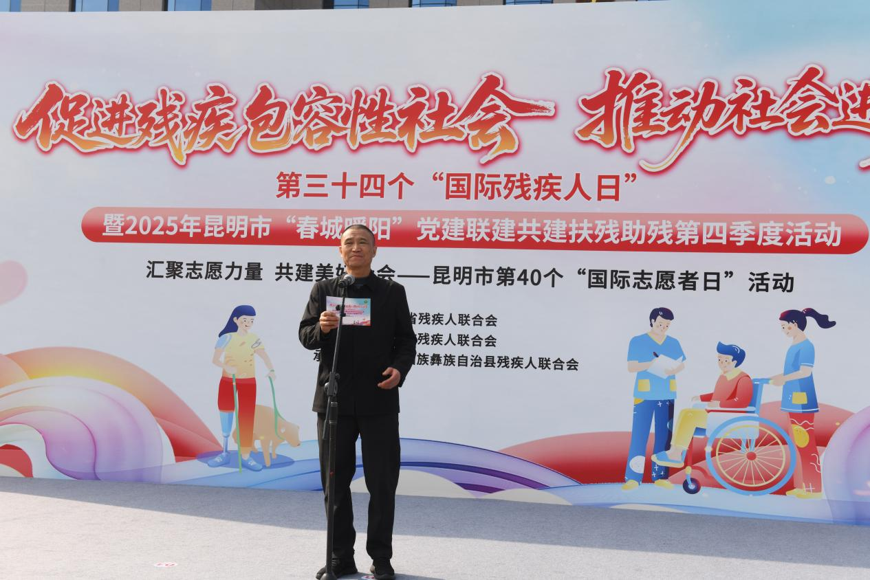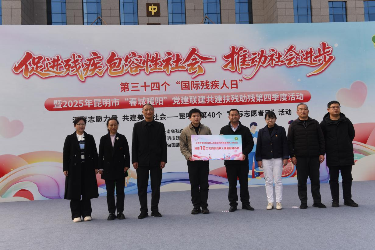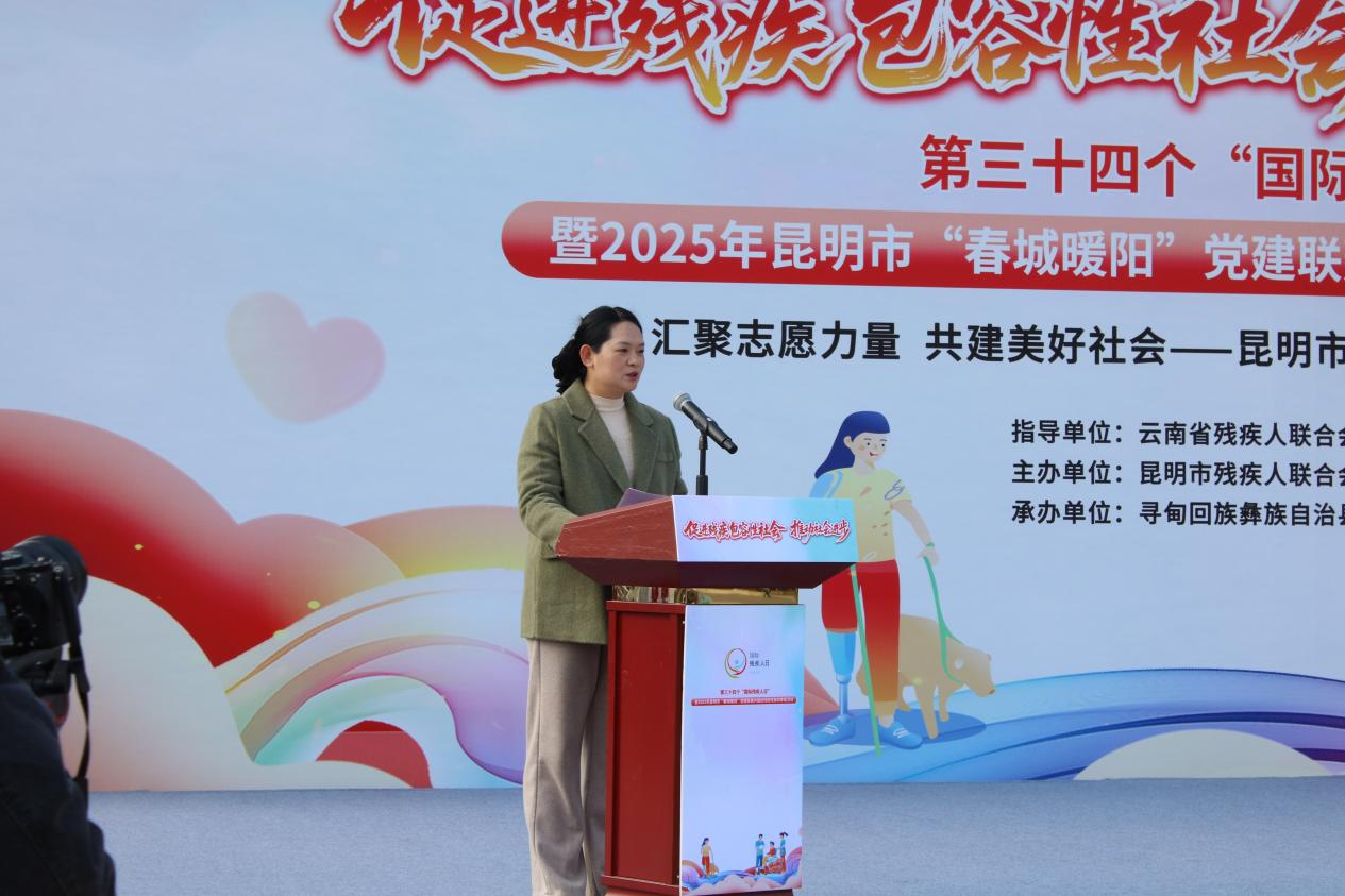 12月2日,昆明市第34个国际残疾人日暨2025年“春城暖阳”党建联建共建扶残助残第四季度活动在寻甸县民族团结进步广场举行。本次活动由云南省残联、昆明市委市直机关工委指导,昆明市残联主办,寻甸县残联承办,以“促进残疾包容性社会 推动社会进步”为主题,依托“春城暖阳”扶残助残党建联盟平台,整合各级党组织资源,通过“七个一”系列活动为残疾人送上关怀与支持,推动形成全社会扶残助残的良好风尚。