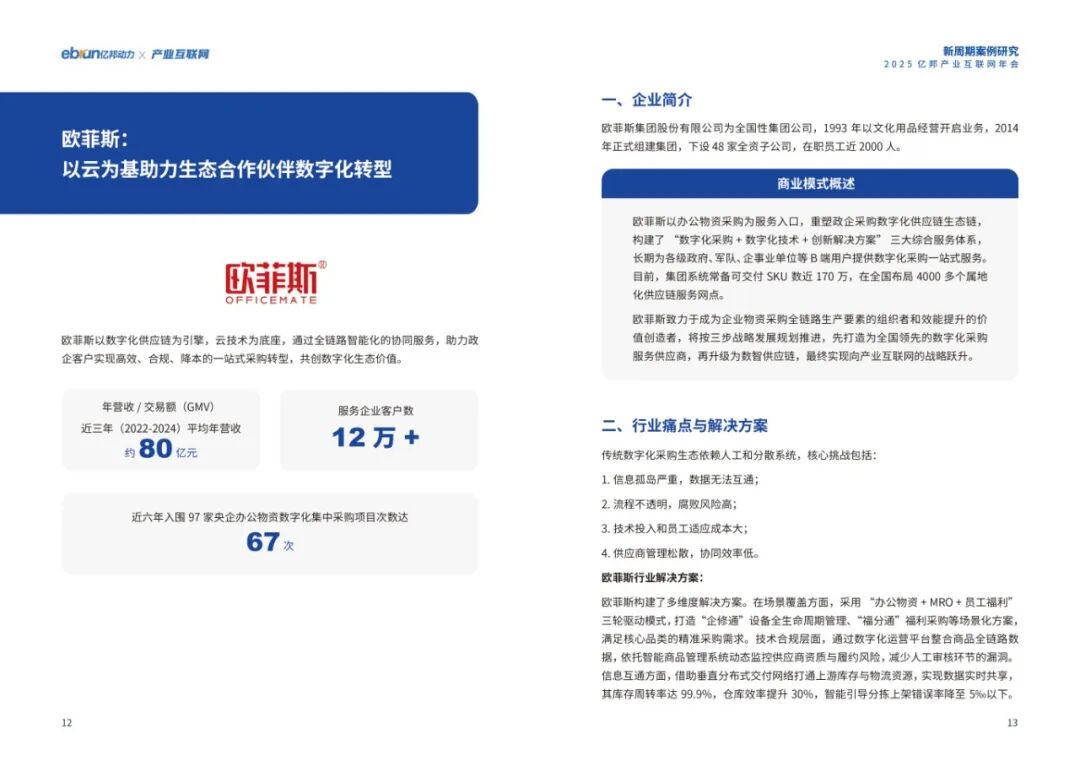12月3日,由亿邦动力主办的2025亿邦产业互联网年会在北京举办。作为政企数字化采购领域的领军者,欧菲斯集团受邀重磅参会,凭借在价值链重构、数字化创新及生态赋能方面的突出成就,荣获 “千峰奖·深度价值链60强” 荣誉,并作为标杆实践案例成功入选《2025产业互联网发展报告》及《新周期领航案例集》。除此之外,欧菲斯集团董事长兼总经理何志受邀出席年度对话环节,参与圆桌对话分享行业洞见。