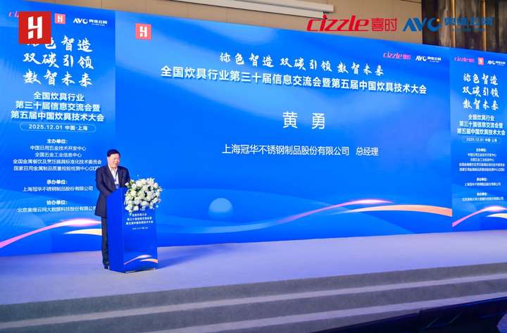 上海冠华不锈钢制品股份有限公司总经理黄勇作为承办方致辞。他表示,崇明生态底色与会议主题契合,作为深耕崇明的本土企业,冠华始终将绿色制造理念融入发展实践,也深刻体会到行业转型期凝聚共识、协同突破的重要性。本次会议是行业“共解难题的会师”,共同推动中国炊具兼具“烟火气”“科技魂”“绿色根”。