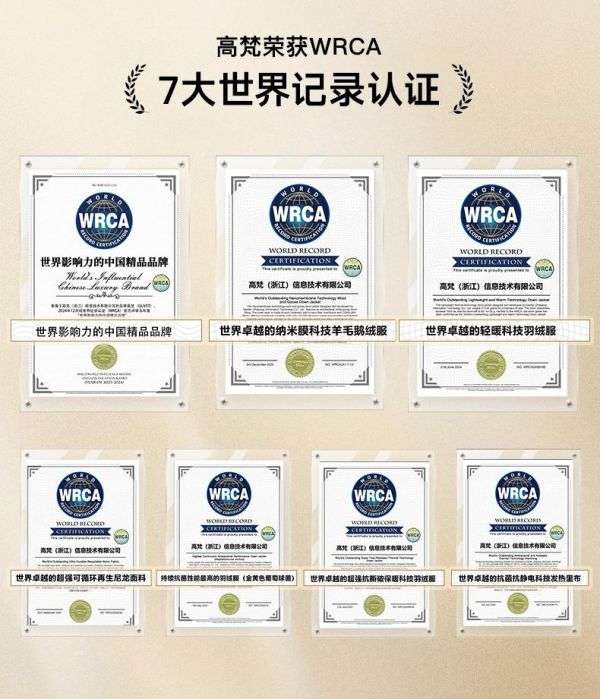 此外,高梵以飞天鹅绒、蓄热科技与185项发明专利,定义了高端鹅绒服奢暖三重基准。正是由于对技术工艺突破的坚持与文化的传承创新,让高梵得以斩获七项WRCA世界纪录认证,其在高端鹅绒服市场连续四年全国销量第一,并连续两年实现好评第一、复购第一和推荐第一的佳绩。