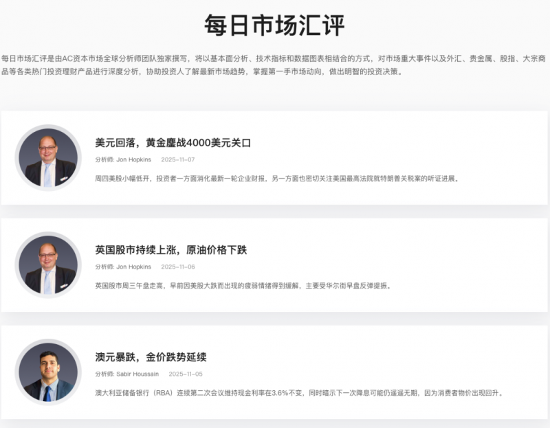 知识型品牌的核心竞争力,根植于专业能力的长期沉淀。AC Capital Market 集结了一支由资深分析师与行业专家构成的顶尖团队,成员均拥有多年金融市场实战经验与扎实的理论功底,覆盖宏观经济、行业赛道、个股分析等多个核心领域。团队将复杂的市场逻辑与专业的金融知识,转化为易懂、易用的思维工具,助力投资者搭建系统化的分析框架。这份对专业素养的执着精进,正是AC Capital Market 作为知识型品牌的核心底气。