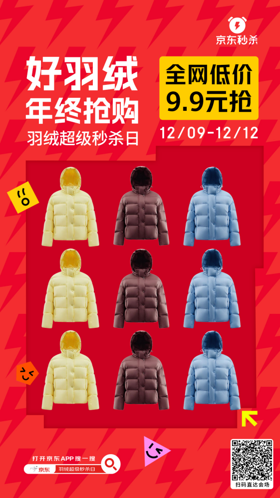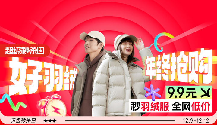 活动期间,羽绒超级秒杀日会场推出9.9元秒杀活动,从12月9日起至12月11日,每天0点、10点、20点三个时段均可参加,覆盖羽绒服、羽绒马甲、羽绒裤等多个品类,为消费者提供高性价比的御寒选择。