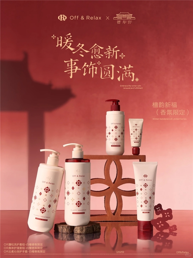 Off&Relax在一年之中最静谧、适合回望与重启的冬日与德寿宫联合推出「檀韵新福」冬季白檀香氛限定系列,正是对这一生活哲学的延续,品牌希望能够陪伴都市旅人们一起慢下脚步,感受宋人慢调闲适的生活方式,于生活细微之处平衡身心自在,以白檀香寄托年末温暖愿望,在年末“洗旧迎新”时刻重新获取能量,感受生活的圆满之态。