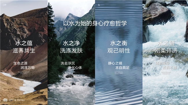 Off&Relax品牌定位亚洲头皮整全愈养专家,30余年专业聚焦亚洲人头皮、发丝特性,深耕亚洲头皮研究与洗护产品开发。以“水”为灵感的品牌哲学,寓含“滋养共生、涤净发肤、观己明性、刚柔并济”,以⽔之⼒,重启头⽪与⾝⼼⾃愈生态。