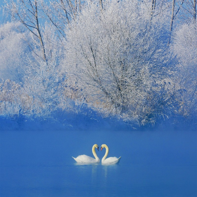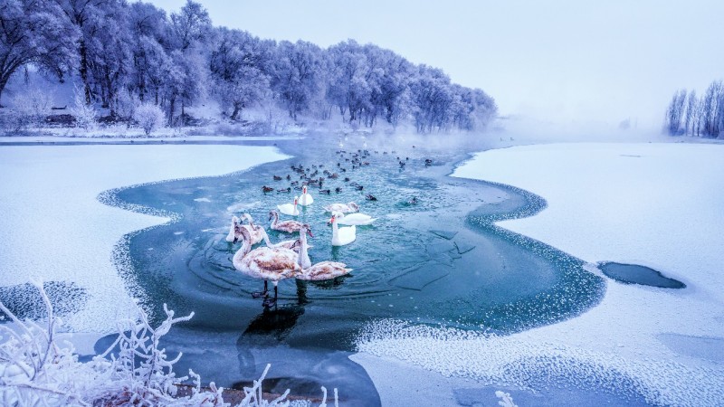 在唯美纯净的天鹅泉,看雾凇下宛如童话的天鹅之恋。