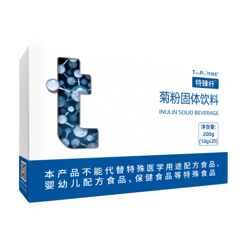 特臻纤®菊粉固体饮料:本品是一款固体饮料,添加4种益生元、2种果粉,0脂0蛋白、极低钠,膳食纤维含量高达96%,每100g仅提供186kcal能量,其中膳食纤维占能量构成的99%。它以抗性糊精、菊粉、水苏糖等为原料,净含量200g(10g×20袋),保质期24个月,建议餐前食用,每次1-2包,1-2次/日,开袋后加入100mL 37-42℃温水搅拌均匀即可饮用,适合需要补充膳食纤维、维持肠道正常功能的人群(婴幼儿不宜食用,每日最大食用限量≤50g),为肠道健康管理提供了低能量、高纤维的便捷解决方案。