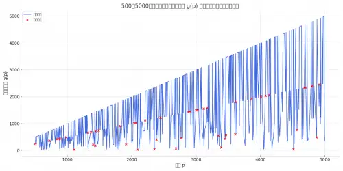 500 到 5000 范围内素数的成功周期数 g(p)走势图