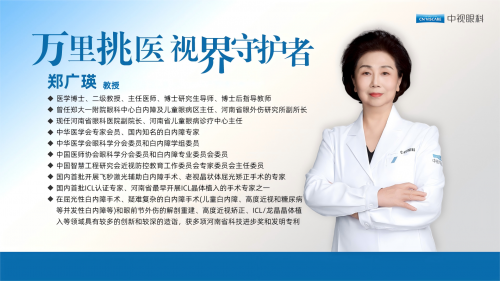 郑州中视眼科作为河南首家民营三级眼科医院,由国内屈光性白内障手术先行者郑广瑛教授领衔。郑教授是中华医学会眼科分会白内障学组委员,从事白内障临床工作30余年,主刀各类白内障手术超10万例,其团队完成河南首例“新复明”白内障手术,并依托EQ平台实现“数据可追溯、流程无纸化”。