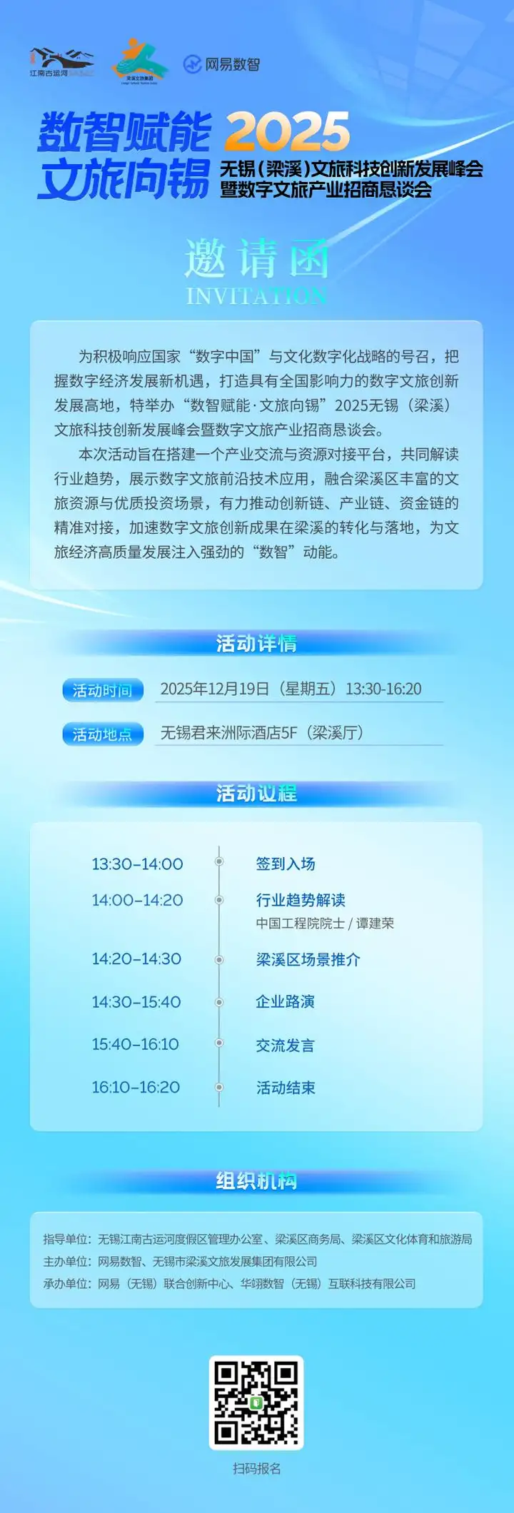 本次活动由无锡江南古运河度假区管理办公室、梁溪区商务局、梁溪区文化体育和旅游局 指导,网易数智、无锡市梁溪文旅发展集团有限公司主办,网易(无锡)联合创新中心、华翊数智(无锡)互联科技有限公司 承办。
