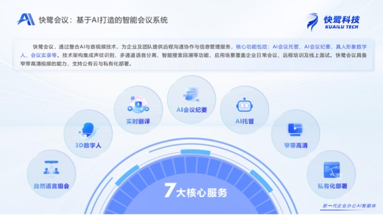 ●AI智能会议系统:快鹭会议整合声纹识别、多语言实时翻译、3D数字人等AI技术,提供从自然语言预约、AI托管、智能纪要到窄带高清视频的全链路服务,重塑远程协作体验。