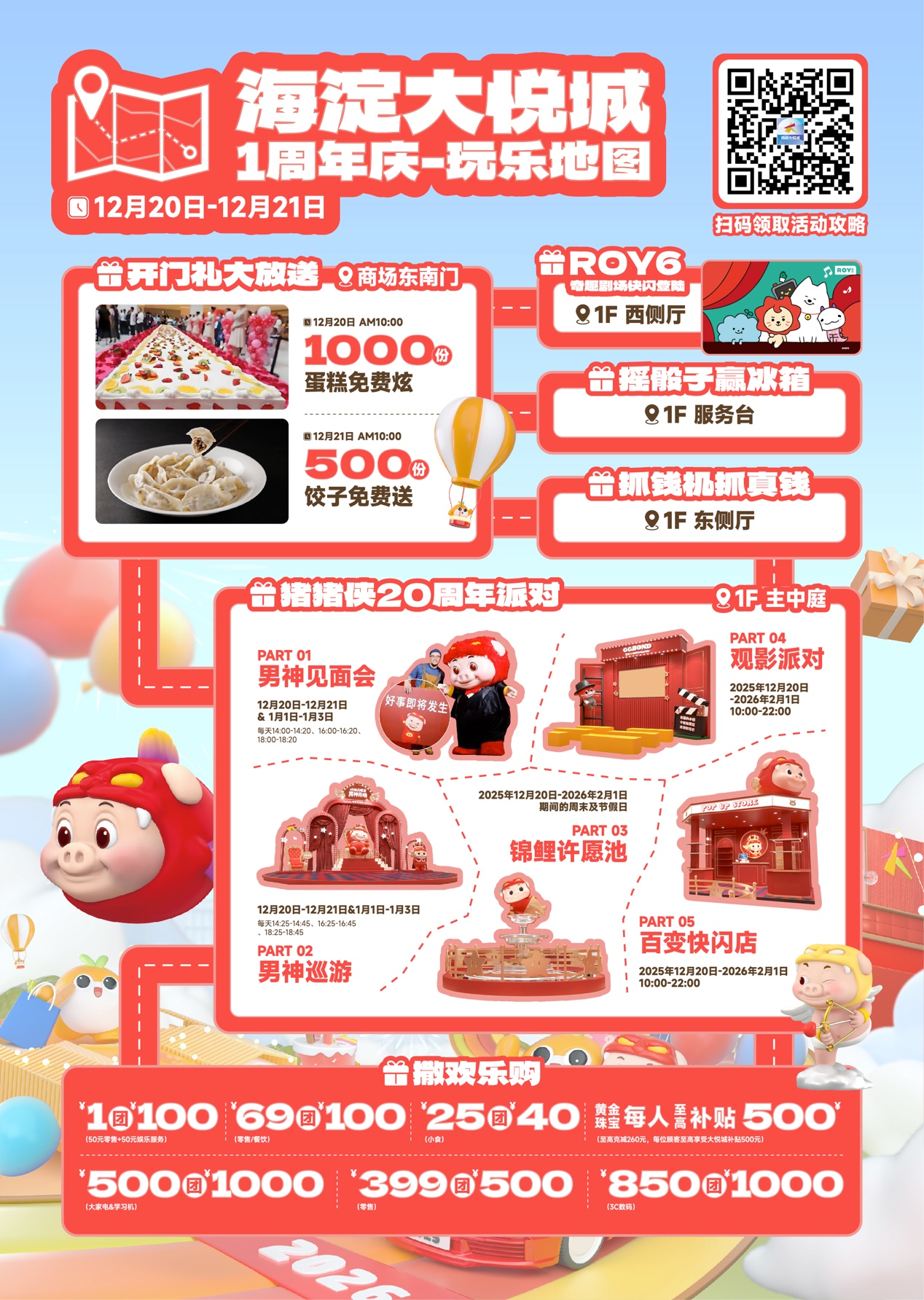 周年庆不仅是文化的庆典,更是回馈全城消费者的购物盛典。海淀大悦城携手场内近300家品牌,推出年度力度空前的促销矩阵:零售方面,推出 1元团100元、49元团100元、69元团100元、399元团500元、500元团1000元 等多档通用团购券,覆盖服装、数码、家居、儿童等全品类;餐饮美食方面,则有 69团100、25团40 等超值券包,汇聚从正餐大餐到轻食小吃的全系美味。此外,黄金珠宝“每人至高补贴500元”、大家电数码专项补贴、多家银行支付满减等多重优惠叠加,诚意十足。这些举措切实响应了促进消费、繁荣市场的号召,旨在通过真金白银的让利与丰富优质的供给,有效激发消费潜能,为北京冬日消费市场注入强劲暖流。
