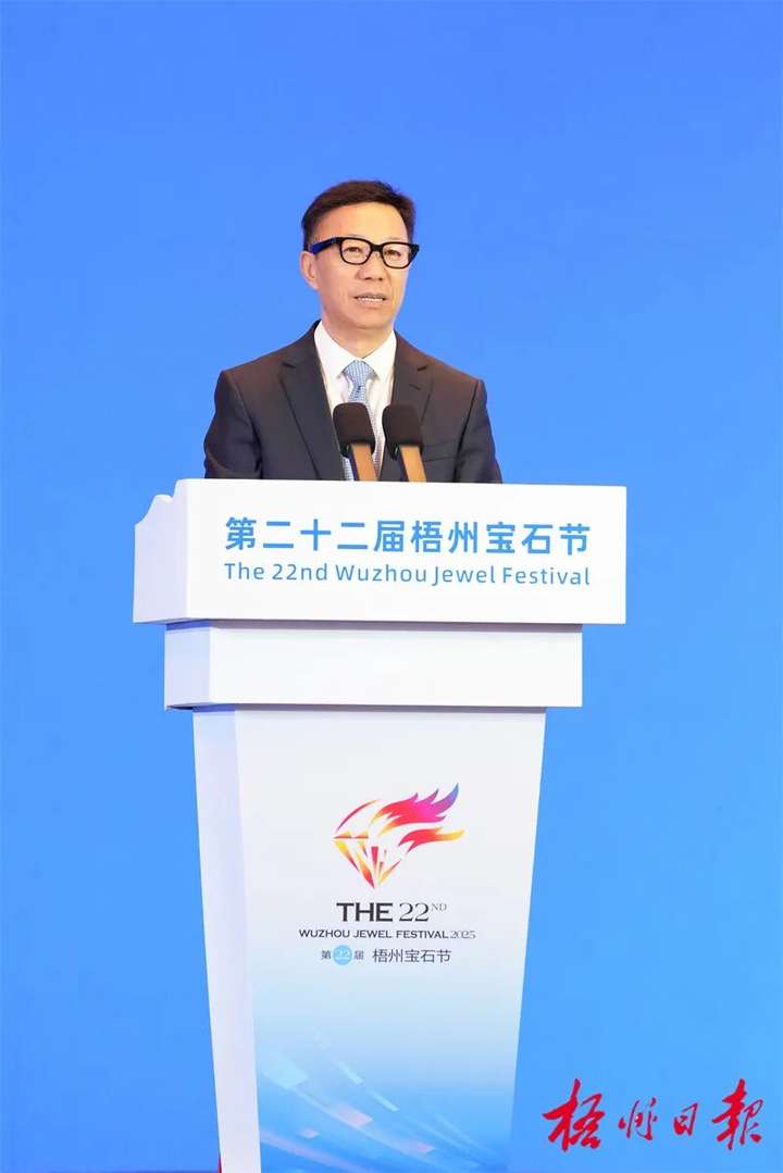 梁艺光在致辞中表示,广西国际博览事务局作为梧州宝石节的共同主办方,多年来始终大力支持梧州宝石节筹办和发展。在今年第22届中国—东盟博览会上,广西国际博览事务局与梧州市一道精心打造科技宝石人工智能展区,全方位展示梧州宝石产业在智能质检、AI设计、自动化镶嵌等领域的先进技术与创新产品,充分彰显“梧州智造”的硬核实力,进一步拓展了梧州宝石产业国际合作空间。2026年是中国—东盟建立全面战略伙伴关系5周年,广西国际博览事务局将高水平办好第23届东博会,推动东博会升级发展,助力梧州宝石产业更好走出广西、走向全国、闪耀世界。
