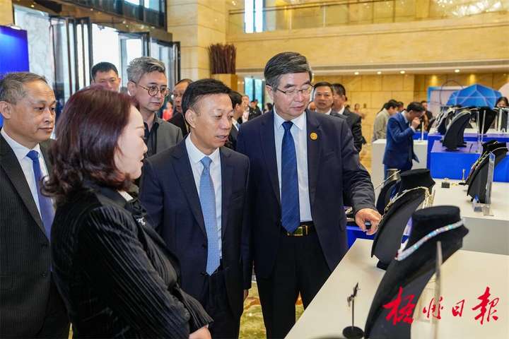 12月19日,与会领导嘉宾来到第二十二届梧州宝石节—珠宝首饰暨名特优产品展销会现场,与宝石企业负责人亲切交流,详细了解梧州宝石产业AI应用、技术创新成果、市场布局等情况。杨扬 摄