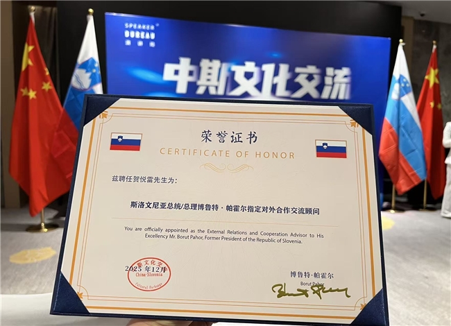 近日,斯洛文尼亚前总统博鲁特·帕霍尔(Borut Pahor)卸任后开启对华友好访问之旅,为中斯两国民间交流与合作注入新活力。12 月 21 日 18 时 30 分,一场承载着深厚友谊与合作期许的私人晚宴如期举行,瑞亿国际总裁贺悦雷先生受邀出席。席间,帕霍尔前总统正式授予贺悦雷先生“对外合作交流顾问”证书,这份认证不仅是对两人多年友谊的见证,更标志着双方将在中斯跨境合作领域开启更深层次的携手共进。