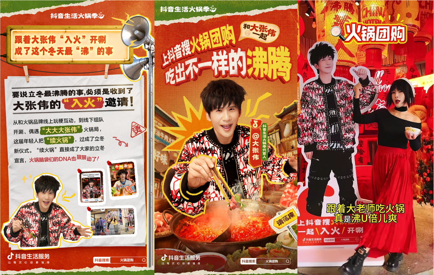 「冬天第一顿火锅」有没有安排上?从立冬当天开始,抖音生活火锅季代言人大张伟就向大家发出了魔性的「入火」邀约,在搜索彩蛋抽签名照、火锅优惠券等福利推动下,「沸腾合火人」们积极跟风开启「立冬火锅局」。随着「大大大张伟」人形立牌等物料入驻多家火锅门店,粉丝们踊跃进店一边嗨吃,一边与大老师花式搞怪合拍。玩梗互动间,越来越多人被「吃顿火锅不叫事儿」的快乐主张感染到,「续火锅」也成了火锅脑袋们的立冬宣言。